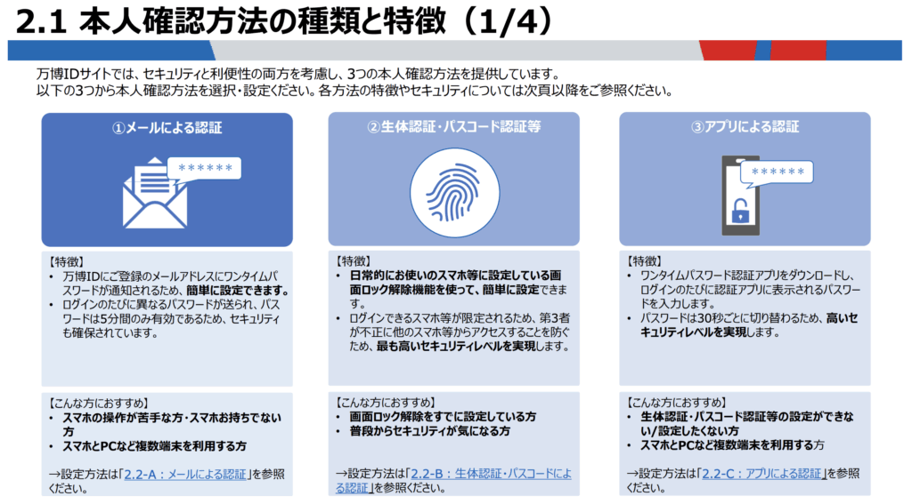 万博IDを登録した後、初回ログイン時に本人確認の設定を行う必要があります。設定手順は以下の通りです。